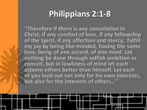 (…) 5 Laat onder u de gezindheid heersen die Christus Jezus had. 6 Hij die de gestalte van God had, hield zijn gelijkheid aan God niet vast, 7 maar deed er afstand van. Hij nam de gestalte aan van een slaaf en werd gelijk aan een mens. En als mens verschenen, 8 heeft hij zich vernederd en werd gehoorzaam tot in de dood – de dood aan het kruis. 9 Daarom heeft God Hem hoog verheven en hem de naam geschonken die elke naam te boven gaat, 10 opdat in de naam van Jezus elke knie zich zal buigen, in de hemel, op de aarde en onder de aarde, 11 en elke tong zal belijden: ‘Jezus Christus is Heer,’ tot eer van God, de Vader. (Uit Filippenzen 2)
