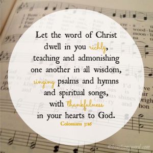 (…) 16 Laat Christus’ woorden in al hun rijkdom in u wonen, zodat gij in alle wijsheid elkaar leert en terechtwijst en met psalmen, lofzangen en geestelijke liederen zingende, aan God dank brengt in uw harten. (Uit Kolossenzen 3)