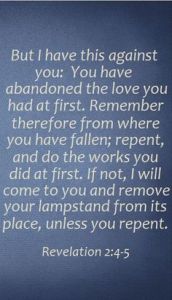 Gedenk dan, vanwaar u gevallen bent, en doet boete, en doet de eerste werken; maar zo niet, dan zal Ik haastig tot u komen, en zal uw kandelaar wegstoten van haar plaats, als u geen boete doet. (Openbaring 2 : 5 – zie a)