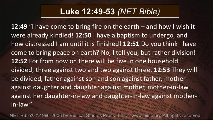 (…) 51 Menen jullie, dat Ik gekomen ben om vrede op aarde te brengen? Nee, zeg Ik jullie, veeleer verdeeldheid. 52 Want van nu aan zullen vijf in één huis verdeeld zijn, drie tegen twee en twee tegen drie. Zij zullen verdeeld zijn, 53 vader tegen zoon en zoon tegen vader, moeder tegen dochter en dochter tegen moeder, schoonmoeder tegen haar schoondochter en schoondochter tegen schoonmoeder.