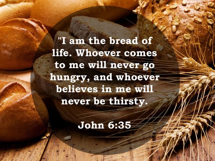(…) 35 En Jezus zei tegen hen: Ik ben het Brood des levens; wie tot Mij komt, zal beslist geen honger hebben, en wie in Mij gelooft, zal nooit meer dorst hebben. (Uit Johannes 6)