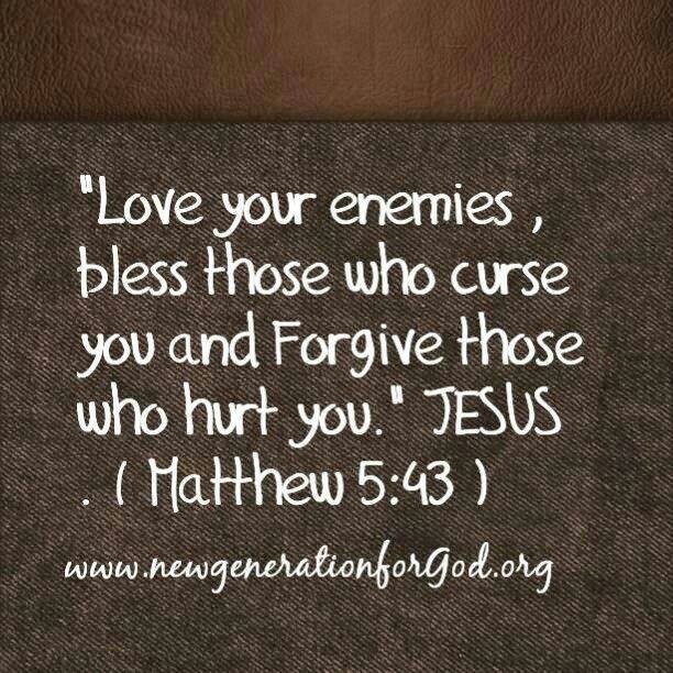 Gij hebt gehoord, dat er gezegd is: Gij zult uw naaste liefhebben, en uw vijand zult gij haten. Maar Ik zeg u: Hebt uw vijanden lief; zegent ze, die u vervloeken; doet wel degenen, die u haten; en bidt voor degenen, die u geweld doen, en die u vervolgen; (Mattheüs 5 : 43)
