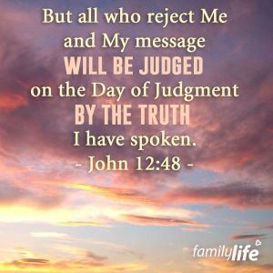 (…) 47 Als iemand mijn woorden hoort maar ze niet bewaart, zal Ik niet over hem oordelen. Ik ben immers niet gekomen om over de wereld te oordelen, maar om de wereld te redden. 48 Wie mij afwijst en mijn woorden niet aanneemt heeft al een rechter: alles wat Ik gezegd heb zal op de laatste dag over hem oordelen.