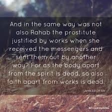 (…) 25 Werd niet ook Rachab, de hoer, rechtvaardig verklaard om wat ze deed, toen ze de verkenners ontving en langs een andere weg liet vertrekken? 26 Zoals het lichaam dood is zonder de geest, zo is ook geloof zonder daden dood. (Uit Jakobus 2)