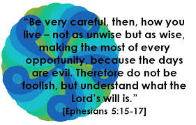 Ziet dus nauwlettend toe, hoe gij wandelt, niet als onwijzen, doch als wijzen, u de gelegenheid ten nutte makende, want de dagen zijn kwaad. Weest daarom niet onverstandig, maar tracht te verstaan, wat de wil des Heren is. (Efeze 5 : 15-17)