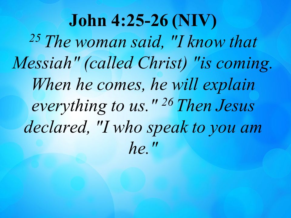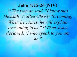 (…) 21 ‘Geloof me,’ zei Jezus, ‘er komt een tijd dat jullie noch op deze berg, noch in Jeruzalem de Vader zullen aanbidden. 22 Jullie weten niet wat je vereert, maar wij weten dat wel; de redding komt immers van de Joden. 23 Maar er komt een tijd, en die tijd is nu gekomen, dat wie de Vader echt aanbidt, Hem aanbidt in geest en in waarheid. De Vader zoekt mensen die Hem zo aanbidden, 24 want God is Geest, dus wie hem aanbidt, moet dat doen in geest en in waarheid.’ 25 De vrouw zei: ‘Ik weet wel dat de messias zal komen’ (dat betekent ‘gezalfde’), ‘wanneer Hij komt zal Hij ons alles vertellen.’ 26 Jezus zei tegen haar: ‘Dat ben Ik, degene die met u spreekt.’ (Uit Johannes 4)