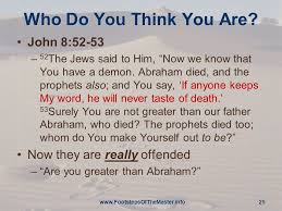 (…) 51 Waarachtig, ik verzeker u: als iemand Mijn woord bewaart zal hij de dood nooit zien.’ 52 Toen zeiden de Joden: ‘Nu weten we zeker dat u bezeten bent! Abraham is gestorven, en de profeten ook, en u zegt: “Wie mijn woord bewaart zal de dood nooit proeven”! 53 Bent u soms meer dan onze vader Abraham, die gestorven is? Ook de profeten zijn gestorven. Wie denkt u wel dat u bent?’ (Uit Johannes 8)