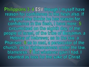 (…) 3 Wij zijn het die besneden zijn, wij verrichten onze dienst door de Geest van God en laten ons voorstaan op Christus Jezus, niet op onszelf, 4 hoewel ik redenen genoeg zou hebben om op mezelf (‘op vlees’) te vertrouwen. (Uit Filippenzen 3)