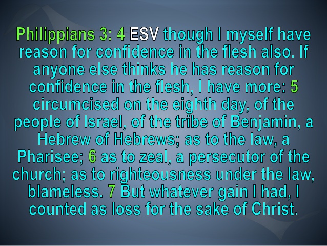 (…) 3 Wij zijn het die besneden zijn, wij verrichten onze dienst door de Geest van God en laten ons voorstaan op Christus Jezus, niet op onszelf, 4 hoewel ik redenen genoeg zou hebben om op mezelf (‘op vlees’) te vertrouwen. (Uit Filippenzen 3)