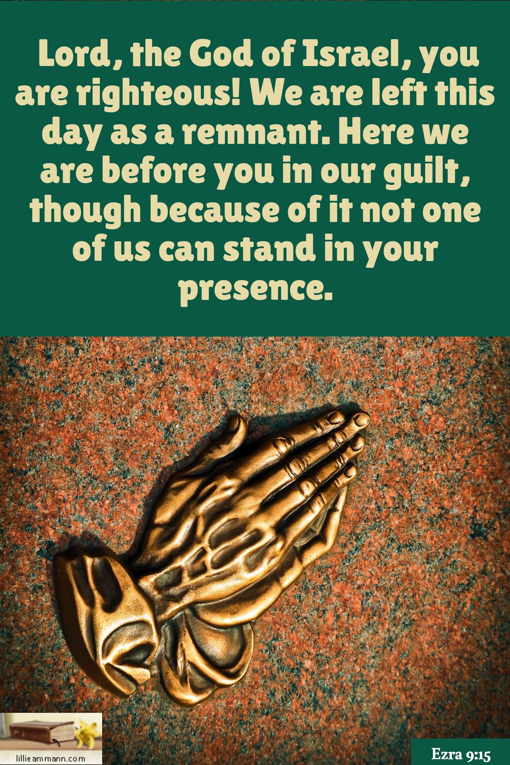 (…) 15 HEER, God van Israël, U bent rechtvaardig, want wij zijn ontkomen, wij zijn overgebleven tot op deze dag. Schuldig staan wij hier voor U – hoe kunnen we U zo onder ogen komen? (Uit Ezra 9)