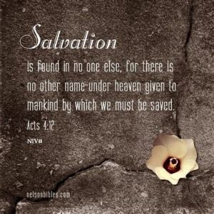 Dit getuigt de apostel Petrus ook op een andere plaats: ‘De zaligheid is in geen ander; want er is onder de hemel ook geen andere Naam, Die onder de mensen gegeven is, door Welke wij moeten zalig worden‘ (Handelingen 4 : 12) ‘En gij zult Zijn Naam noemen JEZUS; want Hij zal zijn volk zalig maken (redden, vrij maken) van hun zonden‘ was de boodschap van de engel uit de hemel (Matteüs 1 : 21).