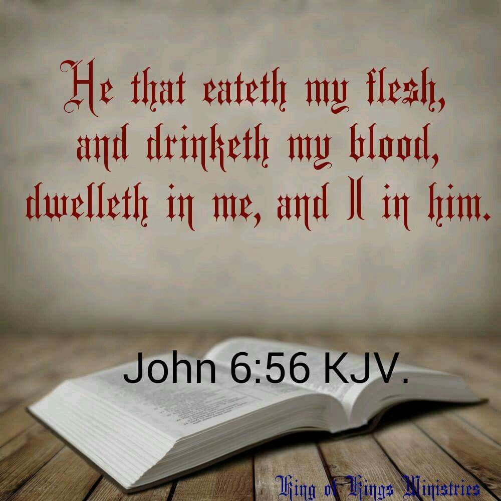 (…) 55 Mijn lichaam is het ware voedsel en mijn bloed is de ware drank. 56 Wie mijn lichaam eet en mijn bloed drinkt, blijft in Mij en Ik blijf in hem. 57 De levende Vader heeft mij gezonden, en ik leef door de Vader; zo zal wie Mij eet, leven door Mij. (Uit Johannes 6)