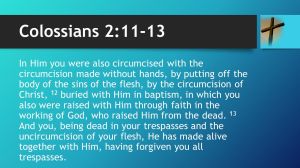 (…) 9 Want in Hem is de goddelijke volheid lichamelijk aanwezig, 10 en omdat u één bent met Hem, het hoofd van alle machten en krachten, bent ook u van Die volheid vervuld. 11 In Hem bent u ook besneden, niet door mensenhanden, maar met de besnijdenis van Christus, door het afleggen van het aardse lichaam. 12 Toen u gedoopt werd bent u immers met Hem begraven, en met Hem bent u ook tot leven gewekt, omdat u gelooft in de kracht van God die Hem uit de dood heeft opgewekt. 13 U was dood door uw zonden en door uw onbesneden staat, maar God heeft u samen met Christus levend gemaakt toen Hij ons al onze zonden kwijtschold. 14 Hij heeft het document met voorschriften waarin wij werden aangeklaagd, uitgewist en het vernietigd door het aan het kruis te nagelen. 15 Hij heeft zich ontdaan van de machten en krachten, Hij heeft hen openlijk te schande gemaakt en in Christus over hen getriomfeerd. (Uit Kolossenzen 2)
