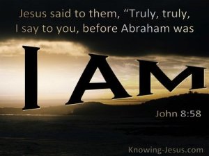 (…) 56 Abraham, uw vader, verheugde zich er sterk op dat hij Mijn dag zou zien, en hij heeft die gezien en heeft zich verblijd. 57 De Joden dan zeiden tegen Hem: U bent nog geen vijftig jaar en hebt U Abraham gezien? 58 Jezus zei tegen hen: Voorwaar, voorwaar, Ik zeg u: Vóór Abraham geboren was, ben Ik. (uit Johannes 8)