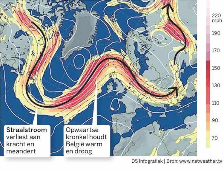 (…) Nu is er iets aan de hand met die luchtrivier. (1) ‘Doordat het noordpoolgebied sneller opwarmt dan de rest van het halfrond, verliest de straalstroom aan kracht en begint hij te kronkelen’, schetst Dehenauw. Of te meanderen, als we toch in de beeldspraak van een rivier zitten (zie grafiek). In de kronkels van die rivier blijven de luchtdrukgebieden als het ware vastzitten. De jongste weken zien we boven West-Europa aanhoudende hogeluchtdrukgebieden. Die veroorzaken de voortijdig zomerse toestanden. ‘Dat was vroeger hoogst uitzonderlijk in ons Belgische klimaat’, zegt Jonas Van de Walle, klimaatonderzoeker aan de KU Leuven.
