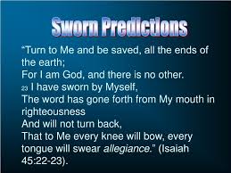 (…) 22 Wendt u tot Mij en laat u verlossen, alle einden der aarde, want Ik ben God en niemand meer. 23 Want Ik heb gezworen bij Mij zelf, waarheid is uit mijn mond uitgegaan, een woord dat niet zal worden herroepen: dat voor Mij elke knie zich zal buigen, dat bij Mij elke tong zal zweren. 24 Alleen bij de Here, zal men van Mij zeggen, is gerechtigheid en sterkte, tot Hem zal men komen; maar beschaamd zullen staan allen die tegen Hem in woede ontstoken zijn; 25 in de Here wordt het gehele nakroost van Israël gerechtvaardigd en zal het zich beroemen. (Uit Jesaja 45)