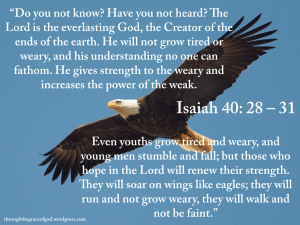 29 Hij geeft de vermoeide kracht en Hij vermeerdert de sterkte van wie geen krachten heeft. 30 Jongeren zullen moe en afgemat worden, jonge mannen zullen zeker struikelen; 31 maar wie de HEERE verwachten, zullen hun kracht vernieuwen, zij zullen hun vleugels uitslaan als arenden, zij zullen snel lopen en niet afgemat worden, zij zullen lopen en niet moe worden. (Uit Jesaja 40)