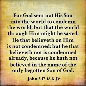 ‘God heeft zijn Zoon niet naar de wereld gestuurd om een oordeel over haar te vellen, maar om de wereld door Hem te redden. Over wie in Hem gelooft wordt geen oordeel uitgesproken, maar wie niet in Hem gelooft is al veroordeeld, omdat hij niet wilde geloven in de naam van Gods enige Zoon.‘ (Johannes 3 : 17-18)