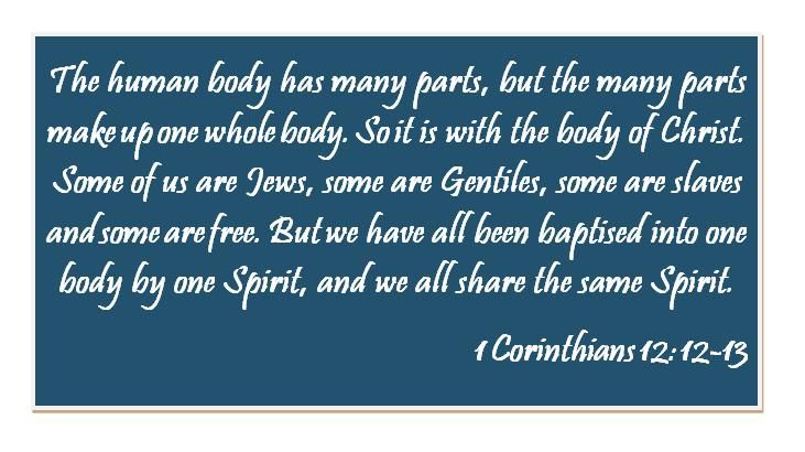 ‘Zo is het ook met het lichaam van Christus. Wij zijn allen gedoopt in één Geest en zijn daardoor één lichaam geworden, wij zijn allen van één Geest doordrenkt, of we nu uit het Joodse volk of uit een ander volk afkomstig zijn, of we nu slaven of vrijen zijn.