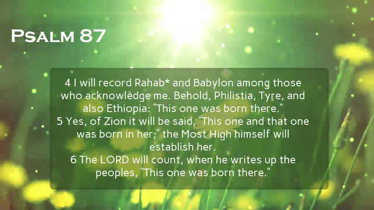 De boodschap van Psalm 87 is: ‘Wir sind alle Juden.’, maar dan in het Hebreeuws: ‘Anachnu Jehudim!’* Alle volken hebben Joodse wortels. Alle volken door wie de Joden zijn vervolgd, die ze als slaaf hebben gediend, waaraan ze als ballingen onderworpen waren, wier godsdienst ze hebben bestreden. Godsdienst, ras – het doet er niet toe – de God van Israël benadert alle andere volken als Israël. Ze horen erbij.