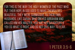 ‘Want zo hebben zich vroeger ook de heilige vrouwen versierd, die hun hoop op God stelden, en aan hun man onderdanig waren; zoals Sara aan Abraham gehoorzaam was en hem heer noemde, van wie u dochters bent geworden, als u goeddoet, en niet zo vreesachtig bent. Zo ook u, mannen, woon bij hen met verstand, en geef aan het vrouwelijke, als aan het zwakkere gereedschap, eer, als mede-erfgenaam van de genade des levens, opdat uw gebeden niet worden verhinderd.‘ (1 Petrus 3 : 5-7).
