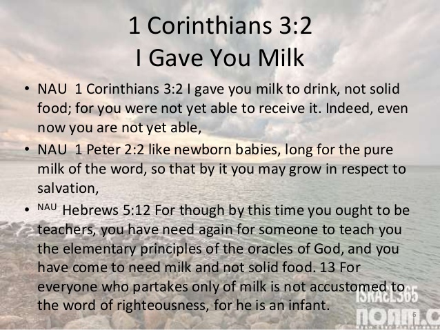 ‘Maar, broeders en zusters, ik kon tot u niet spreken als tot geestelijke mensen. Ik sprak tot mensen van deze wereld, tot niet meer dan kinderen in het geloof in Christus. Ik heb u melk gegeven, geen vast voedsel; daar was u nog niet aan toe. En ook nu nog niet.