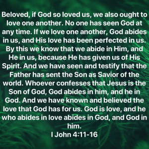 ‘Geliefde broeders en zusters, als God ons zo heeft liefgehad, moeten ook wij elkaar liefhebben. Niemand heeft God ooit gezien. Maar als we elkaar liefhebben, blijft God in ons en is zijn liefde in ons ten volle werkelijkheid geworden. Dat wij in Hem blijven en Hij in ons, weten we doordat Hij ons heeft laten delen in Zijn Geest. En we hebben zelf gezien waarvan we nu getuigen: dat de Vader zijn Zoon gezonden heeft als Redder van de wereld. Als iemand belijdt dat Jezus de Zoon van God is, blijft God in hem en blijft hij in God. Wij hebben Gods liefde, die in ons is, leren kennen en vertrouwen daarop. God is liefde. Wie in de liefde blijft, blijft in God, en God blijft in hem.‘