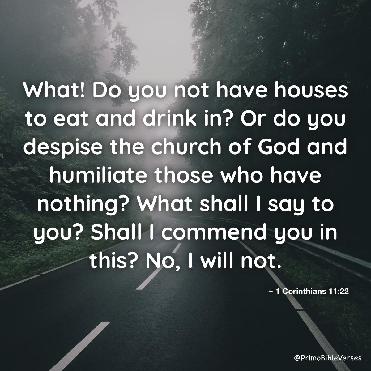 ‘Hebt u soms geen eigen huis waar u kunt eten of drinken? Of veracht u de gemeente van God en wilt u de armen onder u vernederen? Wat moet ik hierover zeggen? Moet ik u soms prijzen? Dat doe ik in geen geval‘ (Uit 1 Korintiërs 11 vers 22)