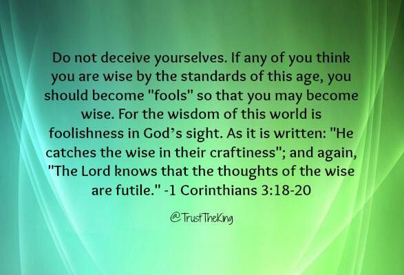 ‘Laat niemand zichzelf bedriegen. Wanneer iemand van u denkt dat hij in deze wereld wijs is, moet hij eerst dwaas worden; pas dan kan hij wijs worden.‘ (Uit 1 Korintiërs 3 vers 18)