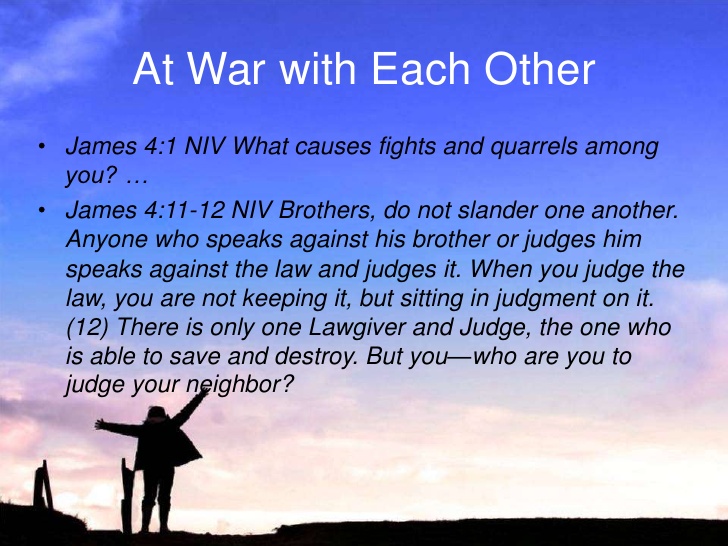 Tot slot: ‘Spreek geen kwaad van elkaar, broeders en zusters. Wie kwaad spreekt van een ander of een ander veroordeelt, spreekt kwaad van de wet en veroordeelt de wet. En als u de wet veroordeelt, handelt u niet naar de wet, maar treedt u op als rechter. Er is maar één Wetgever en Rechter: Hij die bij machte is om te redden of in het verderf te storten. Maar wie bent u om uw naaste te veroordelen?‘ (Uit Jakobus 4 de verzen 11-12. Zie hierbij ook Romeinen 3 de verzen 9-31).