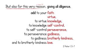 ‘Span daarom al uw krachten in om uw geloof te verrijken met deugdzaamheid, uw deugdzaamheid met kennis, uw kennis met zelfbeheersing, uw zelfbeheersing met volharding, uw volharding met vroomheid, uw vroomheid met liefde voor uw broeders en zusters, en uw liefde voor uw broeders en zusters met liefde voor allen.‘ (Uit 2 Petrus 1 de verzen 5-7)