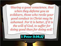 ‘En heb een goed geweten, opdat zij die over u roddelen als over misdadigers, te schande worden, omdat zij uw goede wandel in Christus belasterd hebben, Want het is beter, als het de wil van God is, dat u lijdt vanwege goeddoen, dan vanwege kwaaddoen.‘ (Uit 1 Petrus 3 de verzen 16-17)