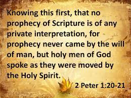 ‘Dit moet u allereerst weten, dat geen enkele profetie van de Schrift een eigenmachtige uitleg toelaat; want de profetie is destijds niet voortgebracht door de wil van een mens, maar heilige mensen van God, door de Heilige Geest gedreven, hebben gesproken.‘ (2 Petrus 1 de verzen 20-21, HSV)