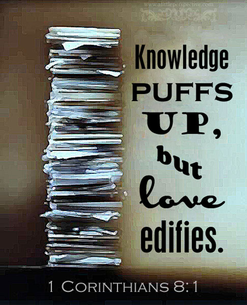 ‘Kennis maakt opgeblazen, maar liefde sticht. Indien iemand zich inbeeldt enige kennis verworven te hebben, dan heeft hij nog niet leren kennen, zoals het behoort.‘ (Uit 1 Korintiërs 8 de verzen 1-2)