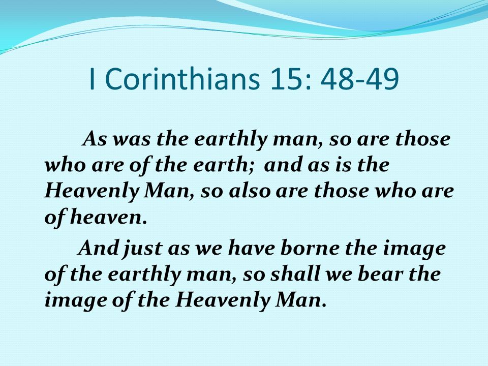 ‘Ieder stoffelijk mens is als de eerste mens, ieder hemels mens is als de Tweede. Zoals we nu de gestalte van de stoffelijke mens hebben, zo zullen we straks de gestalte van de hemelse Mens hebben.‘ (Uit 1 Korintiërs 15 de verzen 48-49)