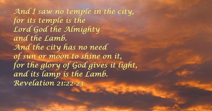 ‘Maar een tempel zag ik niet in de stad, want God de Heer, de Almachtige is haar tempel, met het Lam. De stad heeft het licht van de zon en de maan niet nodig; over haar schijnt Gods luister, en het Lam is haar licht.‘ (Uit Openbaring 21 de verzen 22-23)