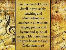 ‘Laat Christus’ woorden in al hun rijkdom in u wonen; onderricht en vermaan elkaar in alle wijsheid, zing voor God met heel uw hart psalmen, hymnen en liederen die de Geest u vol genade ingeeft.‘ (Uit Kolossenzen 3 vers 16)