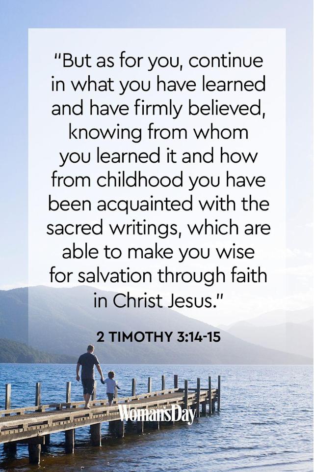‘Blijf gij echter bij wat u geleerd en toevertrouwd is, wèl bewust van wie gij het hebt geleerd, en dat gij van kindsbeen af de heilige schriften kent, die u wijs kunnen maken tot zaligheid door het geloof in Christus Jezus. Opdat de mens Gods volkomen zij, tot alle goed werk volkomen toegerust.’