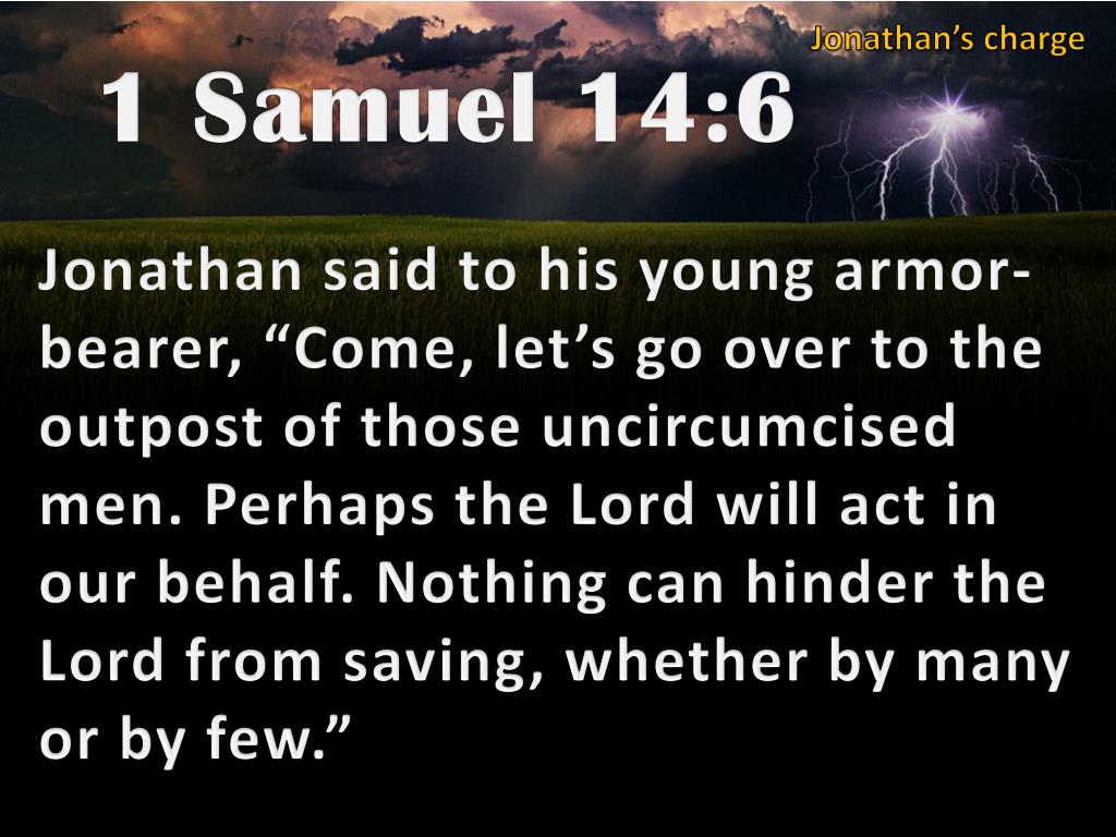 ‘Jonatan nu zei tegen zijn wapendrager: Kom, laten wij oversteken naar de wachtpost van deze onbesnedenen. Misschien zal de Here voor ons handelen, want de Here kan evengoed verlossen door weinigen als door velen.’ (Uit 1 Samuël 14 vers 6)