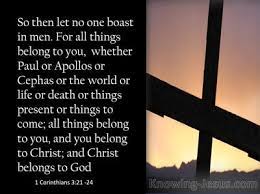 ‘Er staat ook geschreven: “De HEER kent de gedachten van de wijzen: Hij weet dat ze niet meer dan lucht zijn.” Niemand moet van u zich moet zich daarom laten voorstaan op een ander mens, want álles is van u, of het nu Paulus, Apollos, Kefas (Petrus) is, wereld, leven of dood, heden of toekomst – álles is van u. Maar u bent van Christus en Christus is van God.‘ (Uit 1 Korintiërs 3 de verzen 20-23)