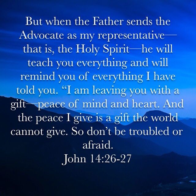 ‘Jezus antwoordde: “Wanneer iemand mij liefheeft zal hij zich houden aan wat ik zeg, Mijn Vader zal hem/haar liefhebben en mijn Vader en Ik zullen bij hem/haar komen en bij hem/haar wonen. Maar wie mij niet liefheeft, houdt zich niet aan wat ik zeg, en wat jullie Mij horen zeggen, zijn niet Mijn woorden, maar de woorden van de Vader door Wie Ik gezonden ben. Dit alles zeg ik tegen jullie nu ik nog bij jullie ben. Later zal de Pleitbezorger, de heilige Geest die de Vader jullie namens Mij zal zenden, jullie alles duidelijk maken en alles in herinnering brengen wat ik tegen jullie gezegd heb.“‘ (Uit Johannes 14 de verzen 23-31)