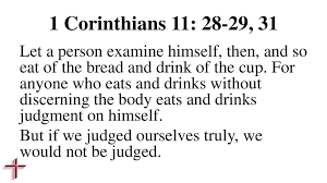 ‘Laat daarom iedereen zichzelf eerst toetsen voordat hij/zij het brood eet en uit de beker drinkt, want wie eet en drinkt en niet beseft dat het om het lichaam van de Heer gaat, roept zijn/haar veroordeling af over zichzelf.‘ (Uit 1 Korintiërs 11 de verzen 28-29)