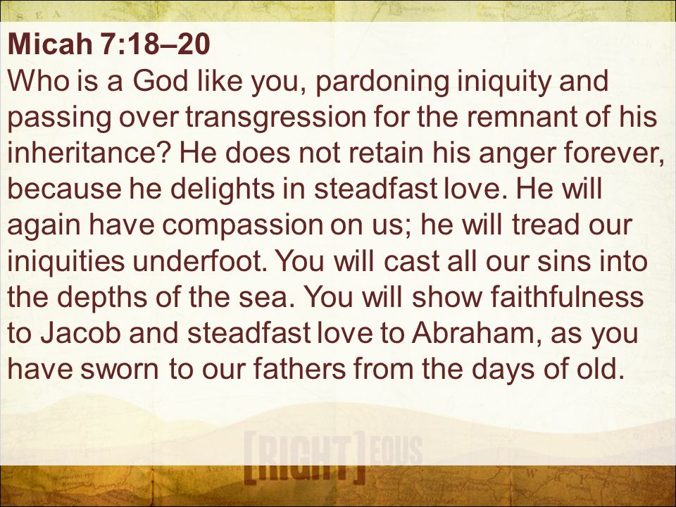 ‘Wie is een God als U, Die schuld vergeeft en aan de zonde voorbijgaat? U blijft niet woedend op wie er van Uw volk nog over zijn; liever toont U hen Uw trouw. Opnieuw zult U zich over ons ontfermen en al onze zonden teniet doen.