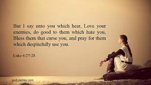 ‘Tot jullie die naar Mij luisteren zeg ik: heb je vijanden lief, wees goed voor wie jullie haten, zegen wie jullie vervloeken, bid voor wie jullie slecht behandelen.’ (Uit Lukas 6 vers 27)