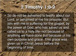 ‘Schaam u dus niet voor het getuigenis van onze Here of voor mij, zijn gevangene, maar wees mede bereid voor het Evangelie te lijden in de kracht van God, die ons behouden heeft en geroepen met een heilige roeping, niet naar onze werken, maar naar zijn eigen voornemen en de genade, die ons in Christus Jezus gegeven is vóór eeuwige tijden, doch die nu geopenbaard is door de verschijning van onze Heiland, Christus Jezus, Die de dood van zijn kracht heeft beroofd en onvergankelijk leven aan het licht gebracht heeft door het Evangelie.‘ (Uit 2 Timoteüs 1 uit de verzen 1-18)