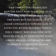 ‘De doop wast niet het vuil van uw lichaam, het is een vraag aan God om een zuiver geweten. Hierom kunt u (altijd weer – AJ) vragen dankzij de opstanding van Jezus Christus, Die de hemel is binnengegaan en aan de rechterhand van God zit, terwijl engelen, machten en krachten aan Hem onderworpen zijn.’ (uit 1 Petrus 3 uit de verzen 21-22)