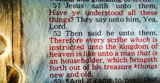 ‘Zo lijkt iedere Schriftgeleerde die leerling in het Koninkrijk van de hemel is geworden op een huismeester die uit zijn voorraadkamer nieuwe en oude dingen tevoorschijn haalt.’ (Uit Matteüs 13 uit vers 52)