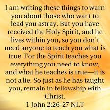 ‘Dit wilde ik u schrijven over hen die proberen u te misleiden. Wat u/jullie zelf betreft: de zalving die u/jullie van Hem ontvangen hebben is blijvend, u/jullie hebben geen leraar nodig. Zijn zalving leert u/jullie alles naar waarheid, zonder bedrog. Blijf daarom (gelovig/door het geloof!) in Hem, zoals Zijn zalving u/jullie geleerd heeft.‘ (Uit 1 Johannes 2 de verzen 26-27)