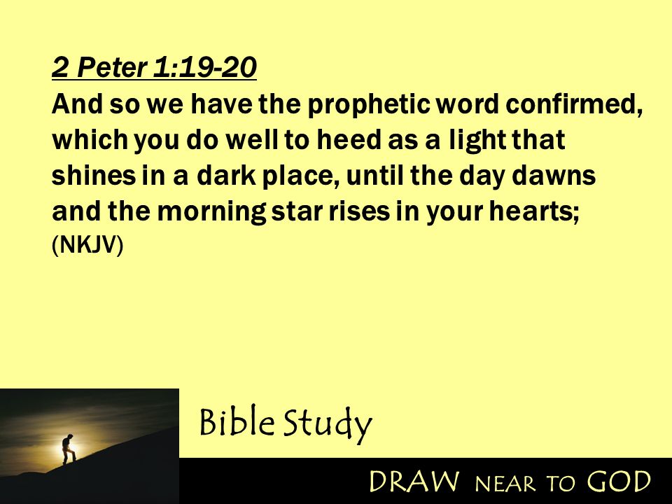 ‘En wij hebben het profetische woord, dat zeer vast is, en gij doet wel, dat gij daarop acht hebt, als op een licht, schijnende in een duistere plaats, totdat de dag aanlichte, en de Morgenster opga in uw harten. Dit eerst wetende, dat geen profetie der Schrift is van eigen uitlegging; Want de profetie is voortijds niet voortgebracht door de wil eens mensen, maar de heilige mensen Gods, van den Heiligen Geest gedreven zijnde, hebben ze gesproken.‘ (Uit 2 Petrus 1 de verzen 19-20, SV)