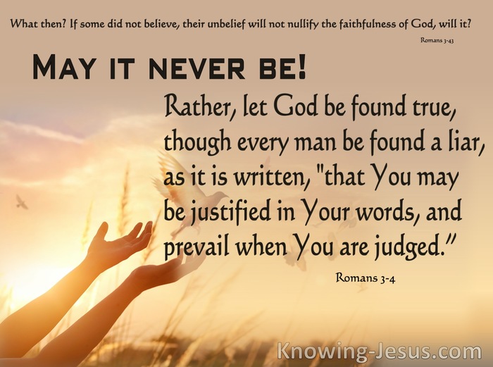 ‘Maar het blijve: God waarachtig en ieder mens leugenachtig, gelijk geschreven staat: Opdat Gij gerechtvaardigd wordt in Uw woorden, en overwint in Uw rechtsgedingen.’ (Uit Romeinen 3 uit vers 4)